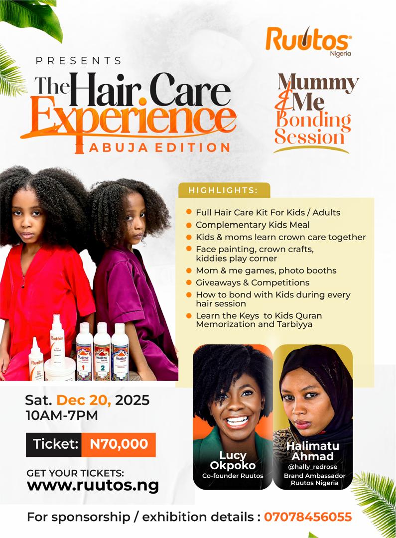Join us for The Hair Care Experience: Abuja Edition β a special Mummy & Me Bonding Session where youβll get expert tips, real-life demos, and yummy mummy guidance from @hally_redrose.